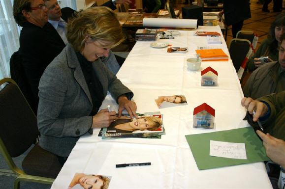 Valerie Niehaus, bekannt als Hauptstar in Verbotene Liebe (1994-’96), sagte einer Signierstunde spontan zu. Das war Eure Chance auf ein ganz persönliches Autogramm vom charmanten TV-Darling! Die in Schauspiel, Tanz, Gesang und Sprachen ausgebildete 33-jährige Wahl-Berlinerin arbeitet seit 1994 nahezu pausenlos für TV-Filme und -Serien; zu sehen unter anderem in Klinik unter Palmen (2000), Vera Brühne (2001), Love Crash (2002), Alles über Anna (2006), Mein alter Freund Fritz (2007). Im Kino: St.-Pauli Nacht (1999), Flashback – Mörderische Ferien (2000), Rohtenburg (2006). Valerie freute sich ganz besonders auf Euch! Mit ihrer Unterstützung konnten an diesem Tag insgesamt 1046,37 Euro an Spenden gesammelt und dem Kinderhospiz Sonnenhof überreicht werden. Herzlichen Dank!