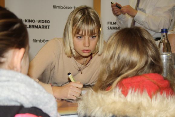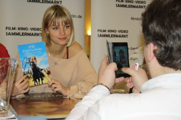 Mit Spannung erwarteten sogar neue Besucher der Filmbörse Berlin die Schauspielerin Hanna Binke aus dem Film Ostwind. Die märchenhafte Mädchenfilmreihe um den titelgebenden Hengst brachte es inzwischen auf drei erfolgreiche Leinwandabenteuer. Die Hauptrolle der reitenden Mika Schwarz spielt Hanna Binke. Erste Schauspielerfahrungen sammelte die jetzt Achtzehnjährige in mehreren Fernsehfilmen (Frühling – Zu früh geträumt) und Serienepisoden (SOKO Wismar, Das Traumhotel), drehte Werbespots, darunter für die "Aktion Mensch"-Kampagne. Bisher mied die etwas scheue Hanna Signierstunden. Doch schnell fühlte sie sich hier in der freundlichen Atmosphäre wohl, plauderte fröhlich und locker mit ihren Fans, während sie alle Autogrammwünsche erfüllte. Manche haben ihre persönlichen Exemplare der Romanreihe Ostwind für eine Widmung vorgelegt. Unsere jähriche Charity-Aktion für die KINDERHILFE e.V. brachte es an diesem Tag auf 810,74 Euro.
