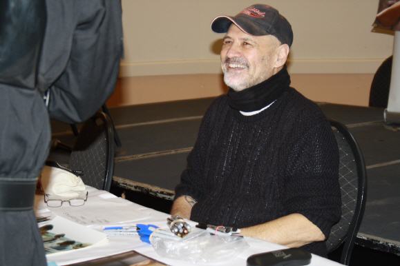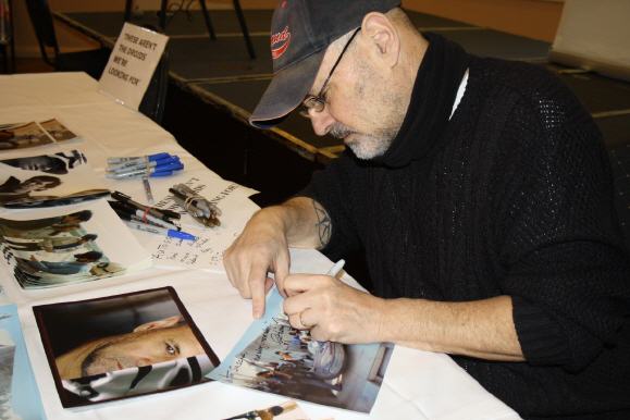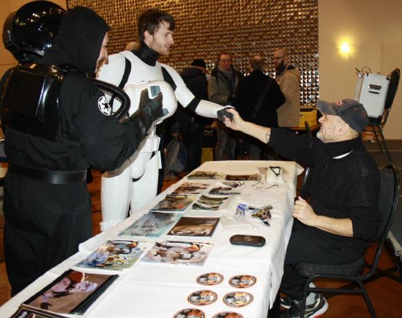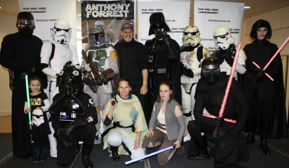 STAR WARS – Episode IV bleibt Kult. Und wenigstens ein Schauspieler hatte zwei Rollen in diesem Epos: Anthony Forrest ist jener Sandtrooper, dessen Line "These aren't the droids we're looking for" ("Das sind nicht die Droiden, die wir suchen") zu den legendärsten des Star-Wars-Universums gehört. Forrest war Crewmitglied auf der USS Wayne in "James Bond 007 – Der Spion, der mich liebte" und spielte den Sgt. Hayley in "Der Adler ist gelandet". Seine persönlichen Erinnerungen an die Anfänge von Star Wars formuliert er im aufschlussreichen Insider-Dokfilm Elstree 1976. Darin thematisiert sind auch jene geschnittenen Szenen seiner zweiten Rolle als Laze "Fixer" Loneozner an der Seite von Mark Hamill auf Tatooine. Gleich zu Beginn der 75. Filmbörse Berlin erschien Anthony Forrest; viele Filmsetfotos, diverse Marker und eigenes PVC-Banner im Handgepäck. Kurz nach 10 Uhr morgens dekorierte er seine Tischreihe unmittelbar vor der Bühne mit großformatigen Filmbildern auf weißem Tischtuch. Sie zeigen ihn "in action" und "behind the scenes" erfolgreicher Spielfilme. Sein Signierplatz war umgehend von Besuchern und Autogrammjägern umlagert. Unter dem Publikum fielen zahlreiche Fans in fantastischen Star-Wars-Kostümen auf, die sich extra für dieses Event "in Schale" warfen. Es kamen Darth Vader, drei Kylo Ren, Rey, Prinzessin Leia, Boba Fett, mehrere Stormtrooper und weitere Uniformierte. Der überaus gut gelaunte und fanaffine Anthony begrüßte Jeden herzlich. Er ging von Anfang an aufmerksam auf die unterschiedlichen Autogrammwünsche ein. Der gebürtige Engländer pflegt einen zweiten Wohnsitz in Deutschland und versteht daher ein wenig die deutsche Sprache. Beim Signieren der angebotenen Fotos und vorgelegten Trading Cards, Toyblister und Soundtracks half manchmal die Zeichensprache. Mit jedem individuellen Photoshooting an der Seite von Anthony Forrest – einem echten Sandtrooper – ging für viele Star-Wars-Fans ein Traum in Erfüllung. Ein privates Gespräch und ein herzlicher Händedruck mit diesem internationalen wie nahbaren Schauspieler wird so Manchem noch lange in angenehmer Erinnerung bleiben. This is the actor you're looking for.