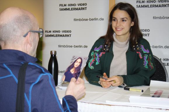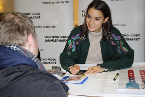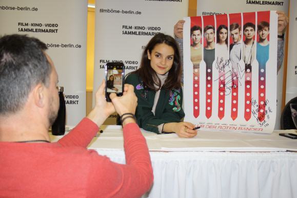 Für die Signierstunde brachte Luise Befort reichlich Autogrammkarten mit. An ihrem Platz auf der Bühne lagen bereits gerollte Filmposter zu Club der roten Bänder – Der Film. Die wurden zuvor von ihrem Schauspielkollegen Timur Bartels markiert. Souverän und routiniert moderierte Börsenveranstalter André Zachau die Charity-Autogrammstunde, während Luise Befort fleißig die Wünsche der Sammler und Spender mit einem zauberhaften Lächeln erfüllte. In kürzester Zeit kamen so 322,40 Euro für den Guten Zweck zusammen. Das Geld bekommt die Kinderhilfe e.V., konkret wird es dort dem Therapiefond für Kati zufließen.