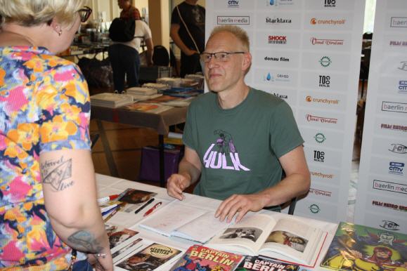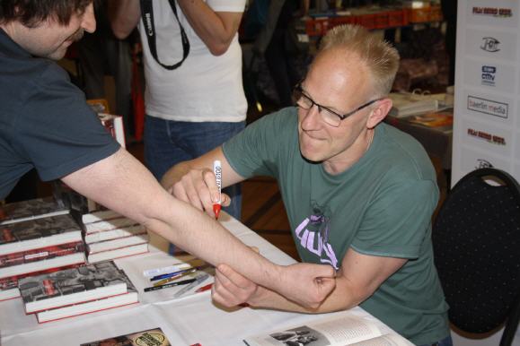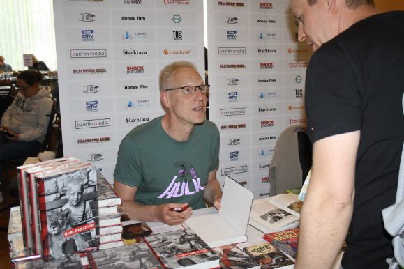 Zwei nationale Ikonen ihres Fachs waren zu Gast auf der 91. Filmbörse Berlin. Ihre gegensätzlichen Metiers führte sie unter ein Dach. Denn Gastgeber und Börsenveranstalter André Zachau lud Jörg Buttgereit und Micaela Schäfer zu Autogrammstunden ein. Top-Erotic-Model Micaela Schäfer stellte sich in die Sache für den Guten Zweck und erfüllte ab 11 Uhr Autogrammwünsche für Geldspenden. Der Erlös würde der Kinderhilfee.V. Berlin zufließen. Das war Schäfers ausdrücklicher Wunsch. Sie war gerüstet für den Ansturm ihrer Fans und bot edles Bildmaterial. Mit Widmungen signiert wurden Fotobücher von Micaela Schäfer, Exemplare der limitierten Dok-Buchreihe Die Welt der Venus, Hochglanzposter und Autogrammkarten nach Wunsch. Es ist schon etwas Besonderes, sein signiertes Exemplar direkt aus erster Hand zu erhalten. Selfie-Wünsche waren ebenfalls möglich. Die Autogrammstunde brachte einen dreistelligen Gesamterlös in Höhe von 375,00 Euro – vielen herzlichen Dank allen lieben Spendern! Der Film-, Hörspiel- und Theater-Regisseur, Filmkritiker und Autor Jörg Buttgereit veröffentlichte im Juni 2023 seine Jugend-Memoiren mit 59 Jahren. Titel des üppig illustrierten Buches mit 368 Seiten: Nicht jugendfrei! Tagebuch aus West-Berlin, erschienen im Martin-Schmitz-Verlag. Die die Auflage im Hardcover beträgt 2000 Stück und wurde auf der 91. Filmbörse Berlin erstmalig vorgestellt. Die Signierstunde begann um 13 Uhr. Viele Besucher schilderten ihren Bezug zum Multikünstler. Jörg Buttgereit kennt einige persönlich. Die letzten Exemplare des Captain-Berlin-Hörspiels auf Doppel-Vinyl-LP gingen hier ebenfalls über den Tisch, signiert vom Erfinder der Heldenfigur. Bereits in den ersten 30 Minuten war die Hälfte der vorrätigen Bücher vergriffen. Für ein Autogramm musste auch ein Arm herhalten.