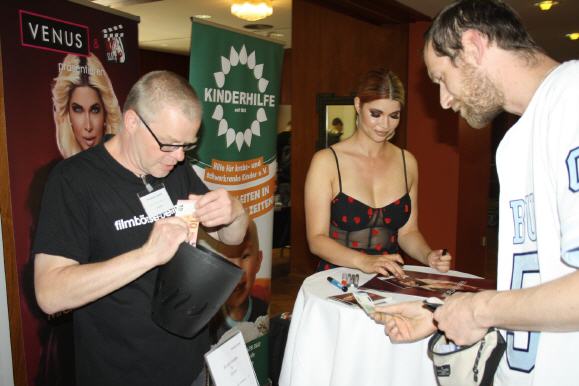 Top-Erotic-Model Micaela Schäfer stellte sich in die Sache für den Guten Zweck und erfüllte ab 11 Uhr Autogrammwünsche für Geldspenden. Der Erlös würde der Kinderhilfee.V. Berlin zufließen. Das war Schäfers ausdrücklicher Wunsch. Sie war gerüstet für den Ansturm ihrer Fans und bot edles Bildmaterial. Mit Widmungen signiert wurden Fotobücher von Micaela Schäfer, Exemplare der limitierten Dok-Buchreihe Die Welt der Venus, Hochglanzposter und Autogrammkarten nach Wunsch. Es ist schon etwas Besonderes, sein signiertes Exemplar direkt aus erster Hand zu erhalten. Selfie-Wünsche waren ebenfalls möglich. Die Autogrammstunde brachte einen dreistelligen Gesamterlös in Höhe von 375,00 Euro – vielen herzlichen Dank allen lieben Spendern!